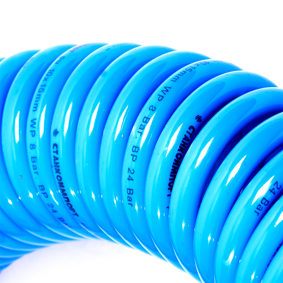 Шланг воздушный спиральный применяется для подачи воздуха от компрессора или линии сжатого воздуха к пневмоинструменту. За счет своей формы в виде спирали, шланг имеет достаточно компактный размер и не мешается под ногами.